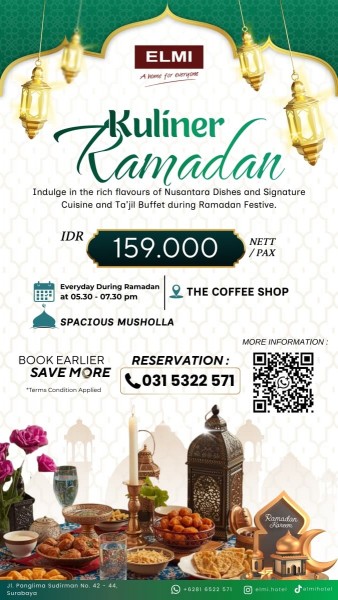 咖啡馆是个美好的饭厅与温馨的氛围,提供各式各样最喜爱的印尼、中国菜和国际标准的欧洲美食。不仅是ELMI大酒店的贵客,许多贵客来只是为了尝试一口美味的饮料选择,同时享受最喜爱的菜肴。我们咖啡厅也是众所周知其在口味上的一致性和我们24小时服务。随时欢迎到我们的咖啡厅。经过辛苦的工作活动或者避免交通高峰时间,我们将竭诚为您服务。ELMI服务。